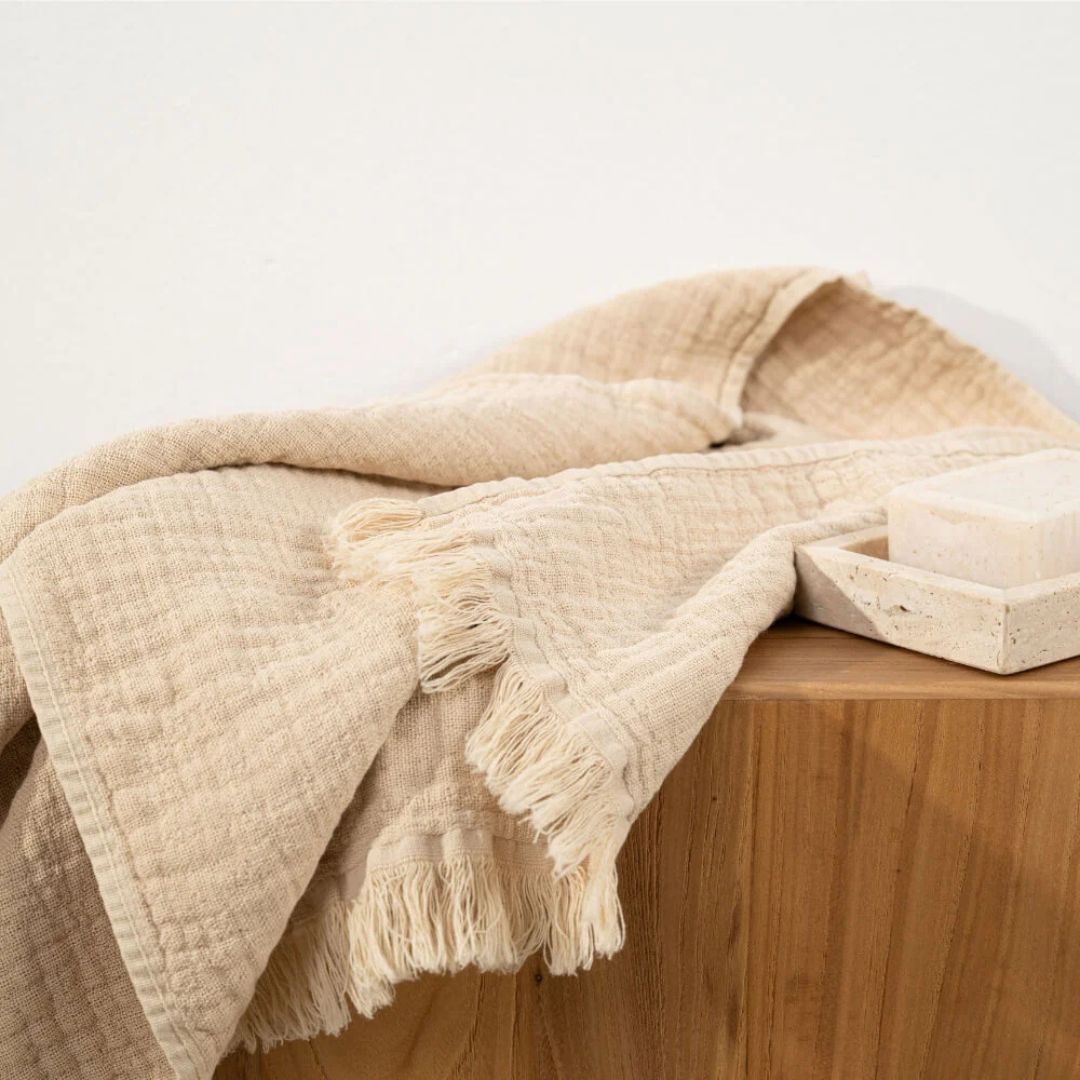 Puoi abbinarlo ad altri tessili neutri per un effetto armonioso oppure usalo come dettaglio decorativo su mensole e lavabi.