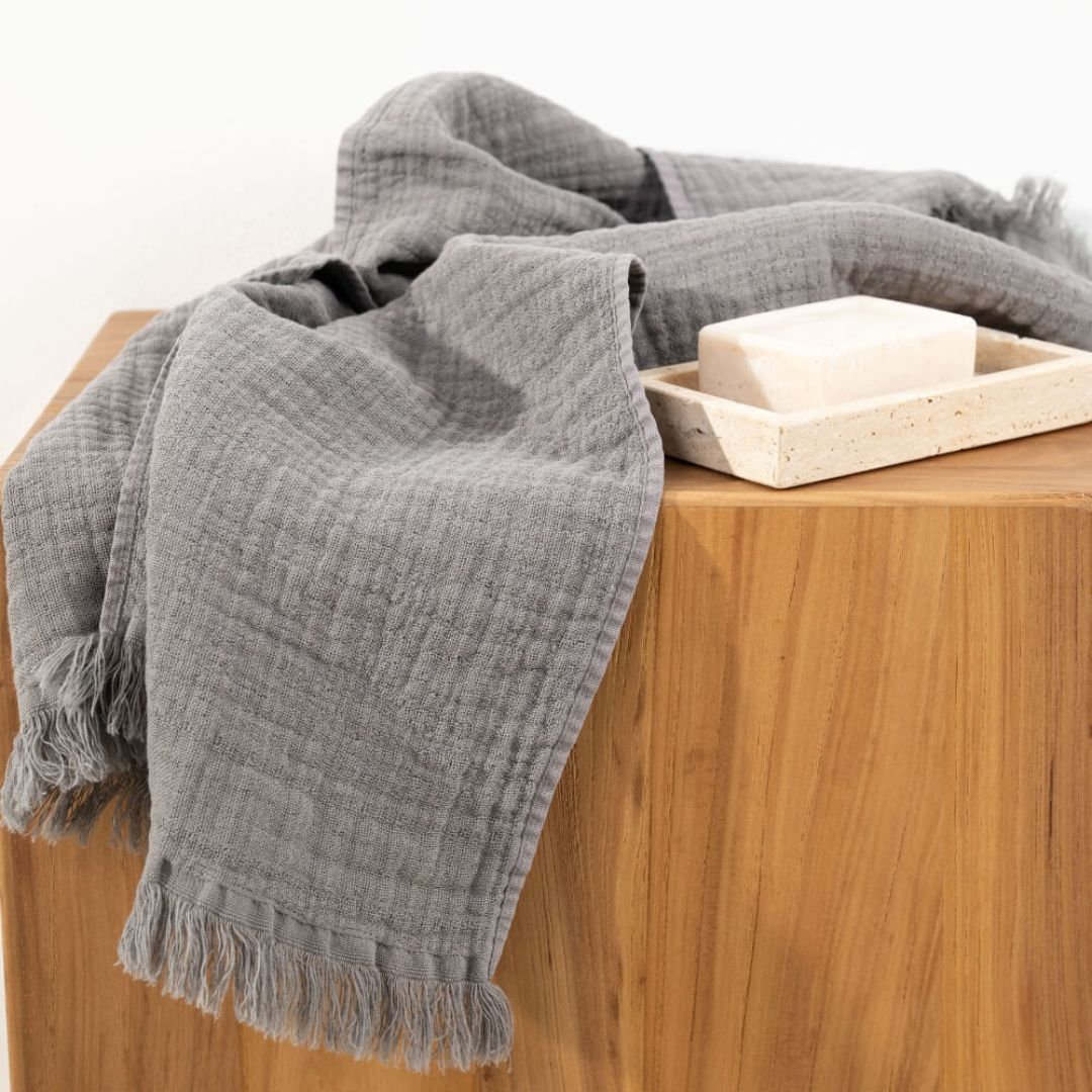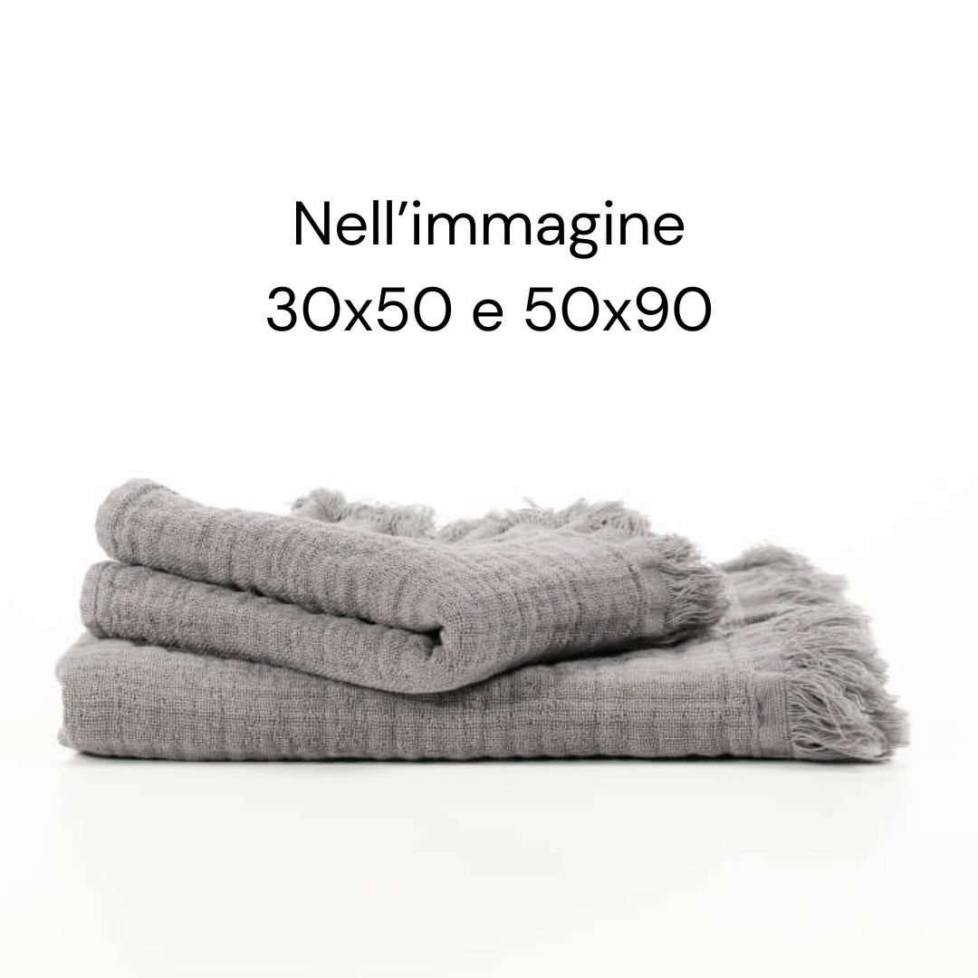 Questo asciugamano in cotone strutturato double-face grafite del brand Moyha dona al bagno un'eleganza moderna e sofisticata. Il contrasto tra texture e colore crea un effetto visivo raffinato, perfetto per ambienti minimal e contemporanei.