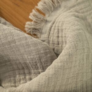 Il suo tessuto strutturato regala una sensazione avvolgente e naturale sulla pelle, mentre le eleganti frange decorative aggiungono un tocco raffinato e contemporaneo.
