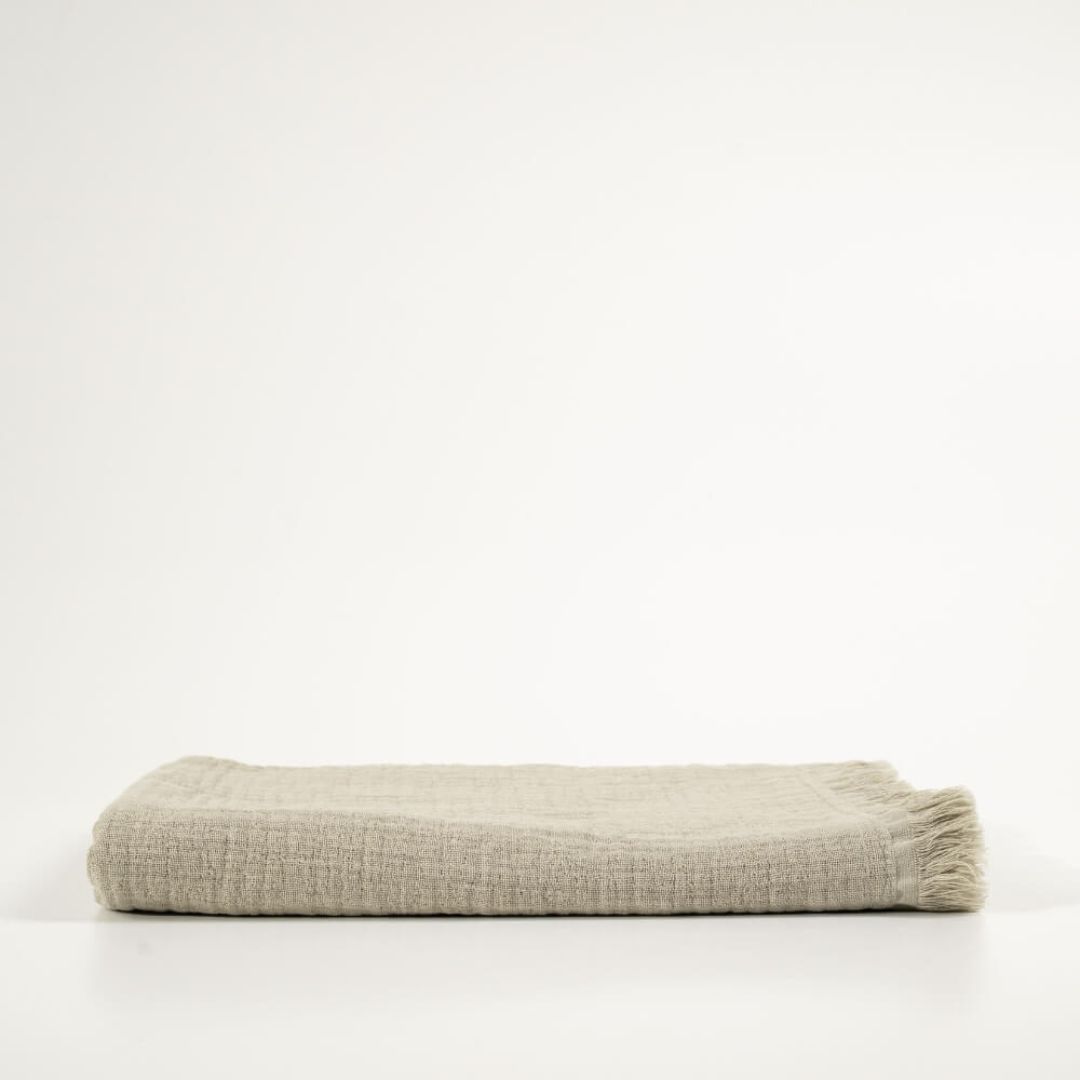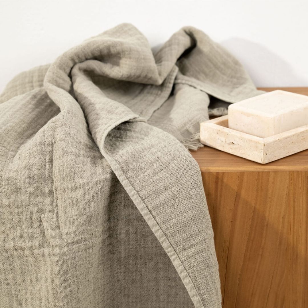 Questo telo bagno in cotone strutturato double-face verde oliva del brand Moyha è la scelta ideale per chi ama materiali naturali e colori ispirati alla terra.
