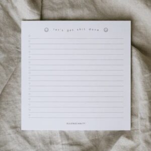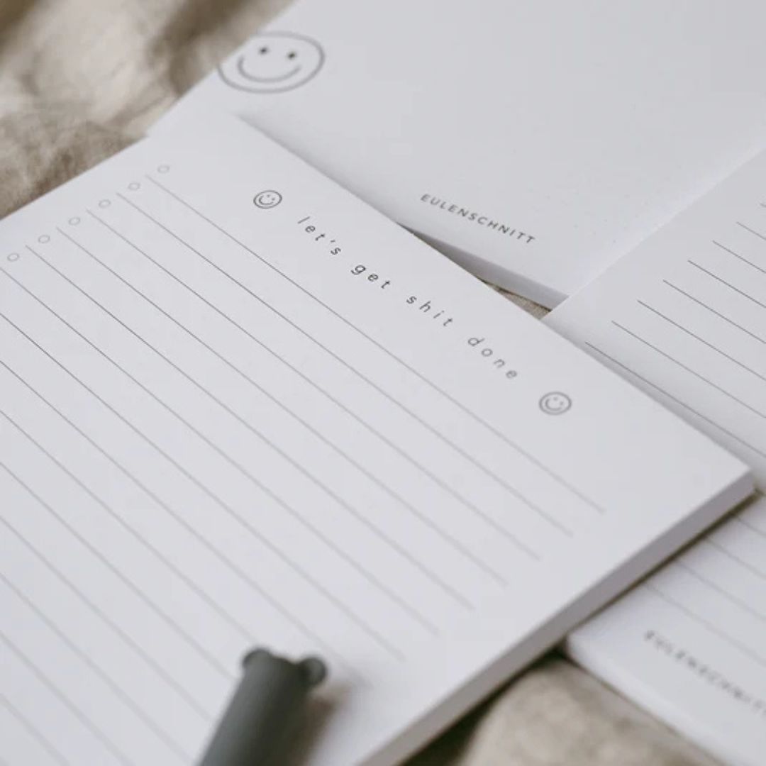 Questo blocco note di design con stampa "Let's get shit done", espressione inglese colloquiale e moto formale che intende "Basta scuse, facciamolo", del brand Eulenschnitt è perfetto per chi vuole affrontare la giornata con determinazione. Il design diretto e la carta pulita li rendono ideali per appunti, piani di lavoro e momenti di concentrazione.