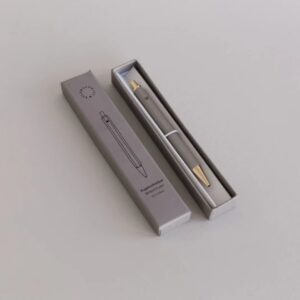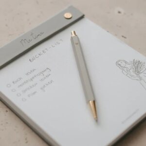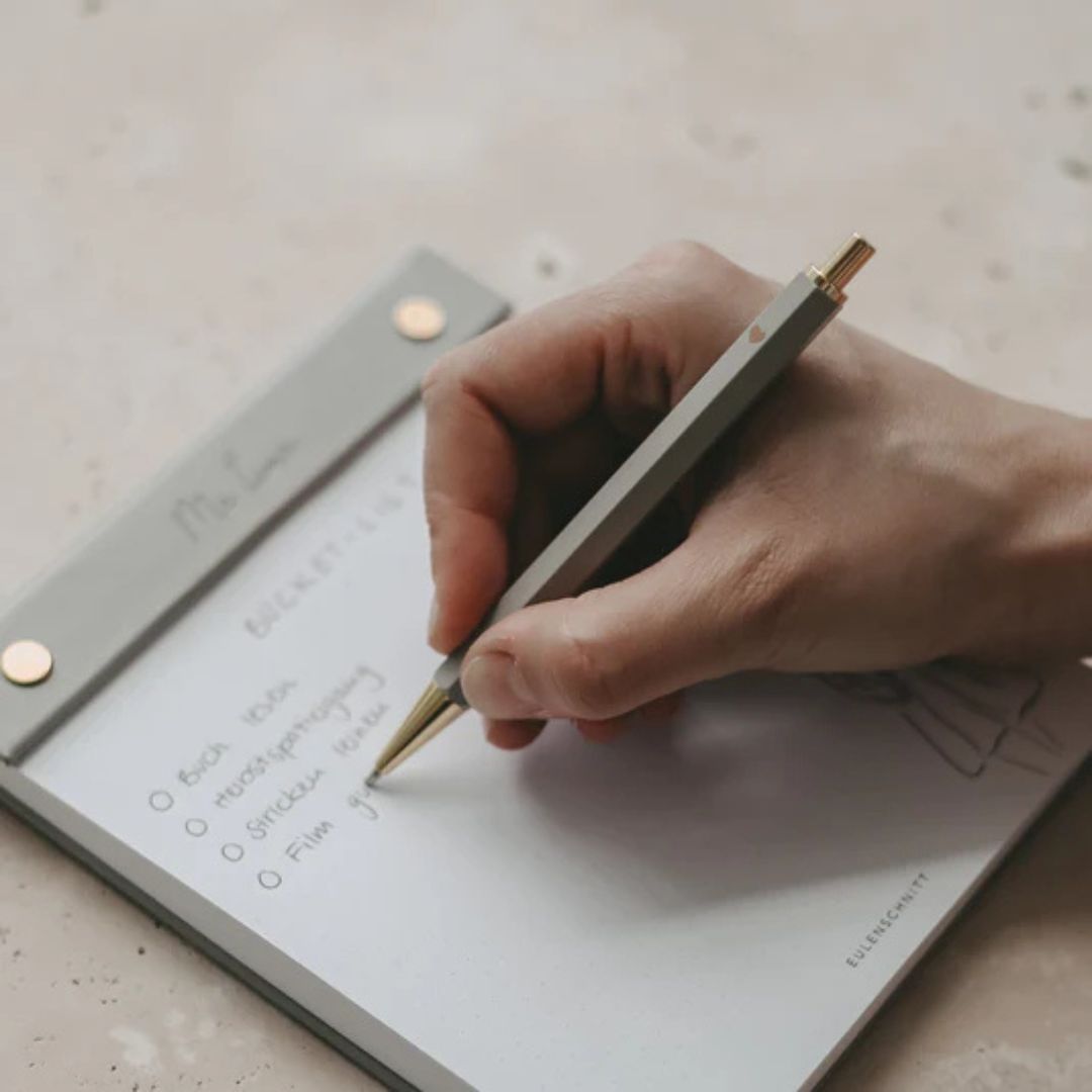 Questa penna a sfera di design grigia del brand Eulenschnitt unisce praticità e stile minimal. Il corpo grigio satinato è elegante e neutro, perfetto da abbinare ai tuoi blocchi note o da usare in ufficio, a scuola o a casa.