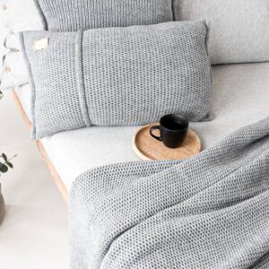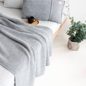La coperta in misto lana lavorata a maglia grigia è un accessorio immancabile sul divano o sul letto sia in inverno che in estate per le serate più fresche.