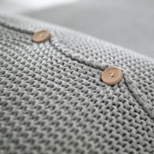La trama ha una bellissima sfumatura grigia ed è impreziosita da una chiusura a bottoni in legno, è un accessorio di design di uso quotidiano comodo, morbido e di grande effetto visivo.