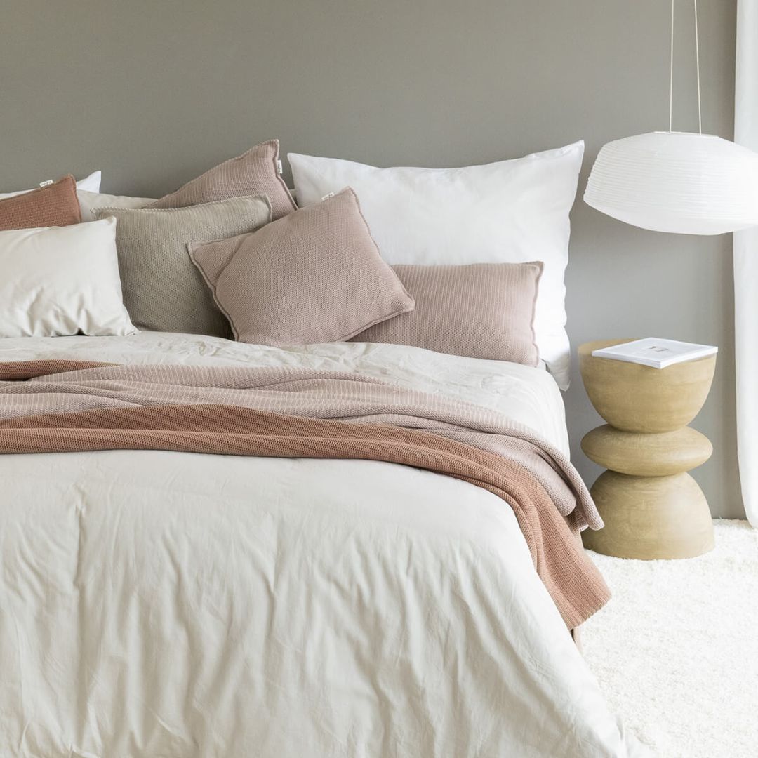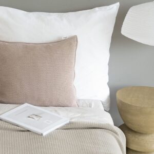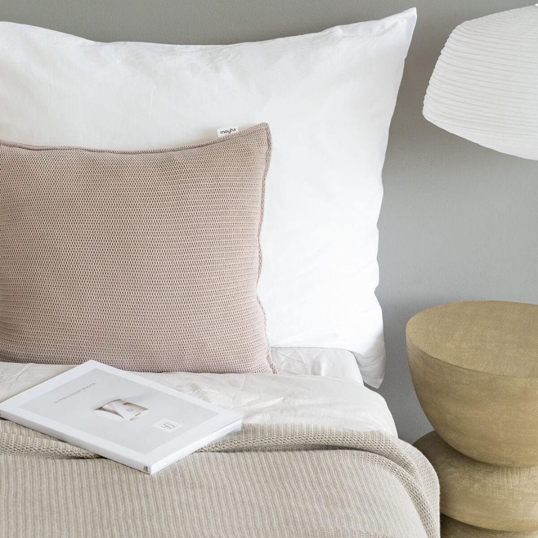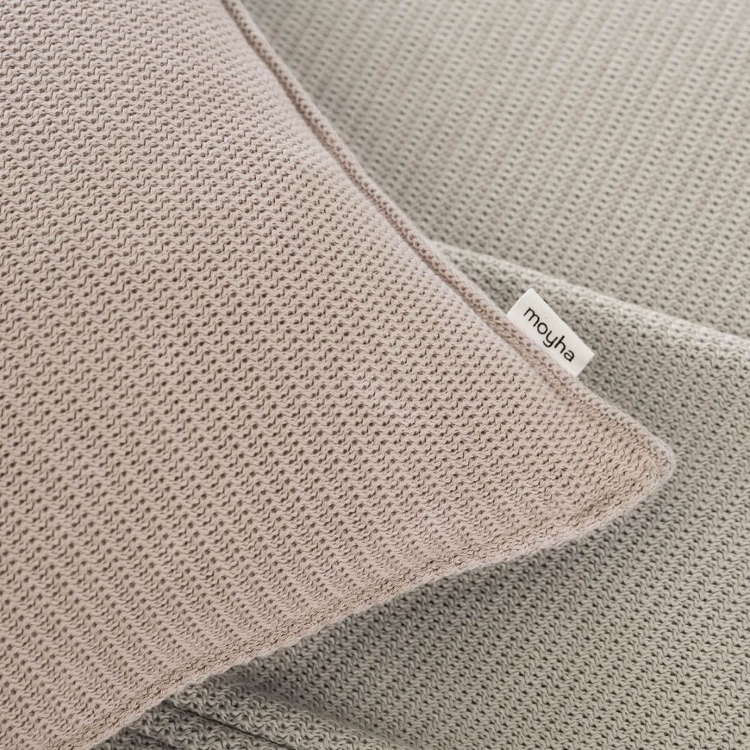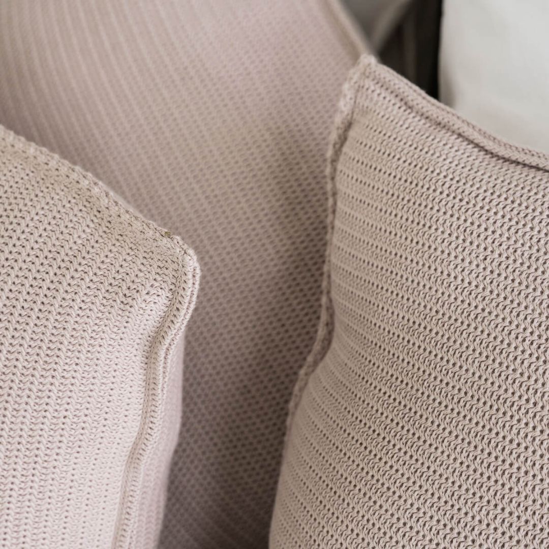 Il copricuscino lavorato a maglia color rosa cipria di Moyha è relizzato in filato di cotone riciclato.