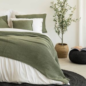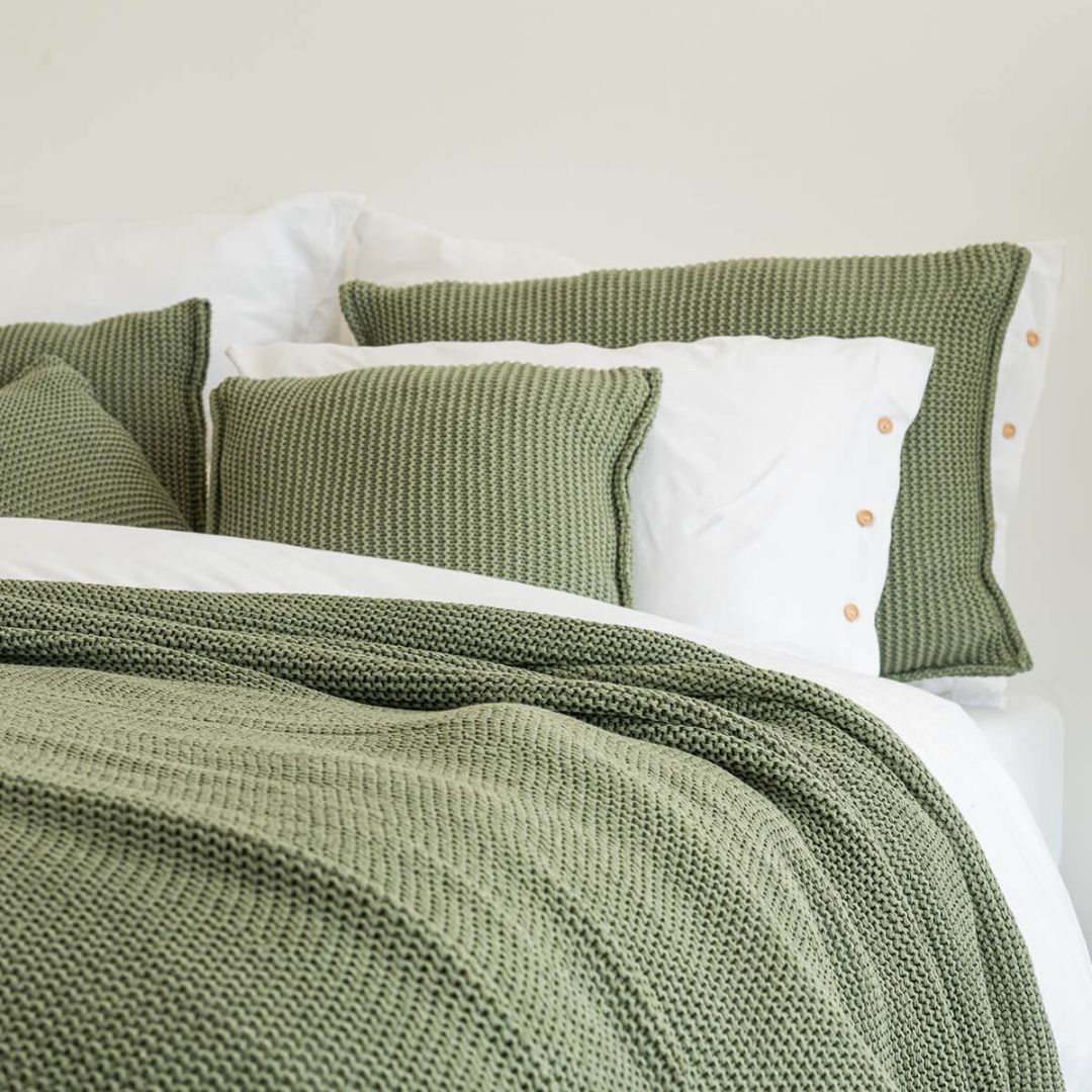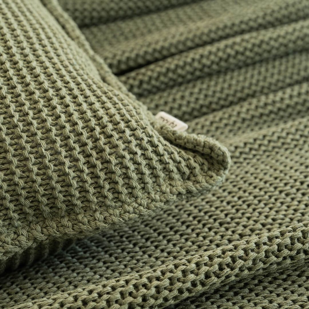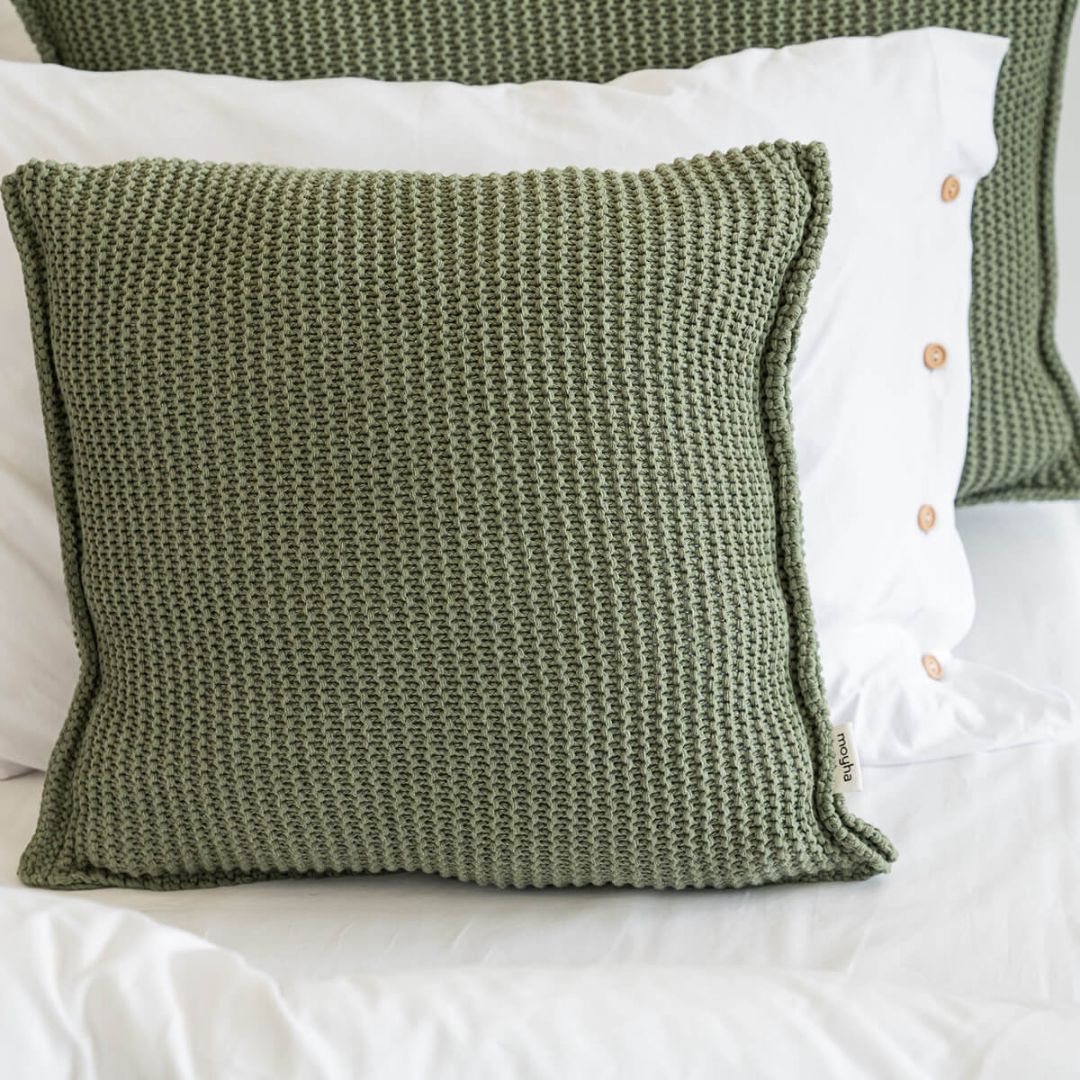 Il copricuscino lavorato a maglia color verde oliva di Moyha ti conquisterà con il suo design unico e corposo, la lavorazione intrecciata donerà calore al divano o alla testiera del letto.