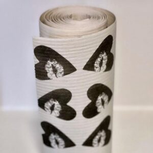 Ciascun panno spugna ha lo sfondo di colore bianco con stampati tanti cuori neri con un bacio all'interno.