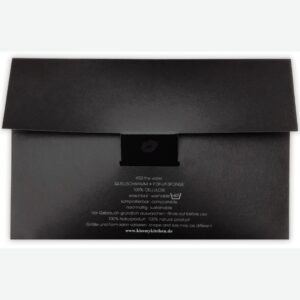 Si presenta in un’elegante busta nera all’interno della quale si trova la Spugna pop-up ecologica dal design con bacio nero disidratata e pressata, basterà immergerla in acqua per vederla moltiplicare di volume come per magia.