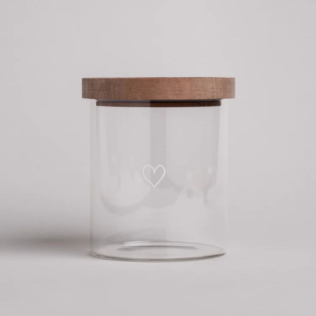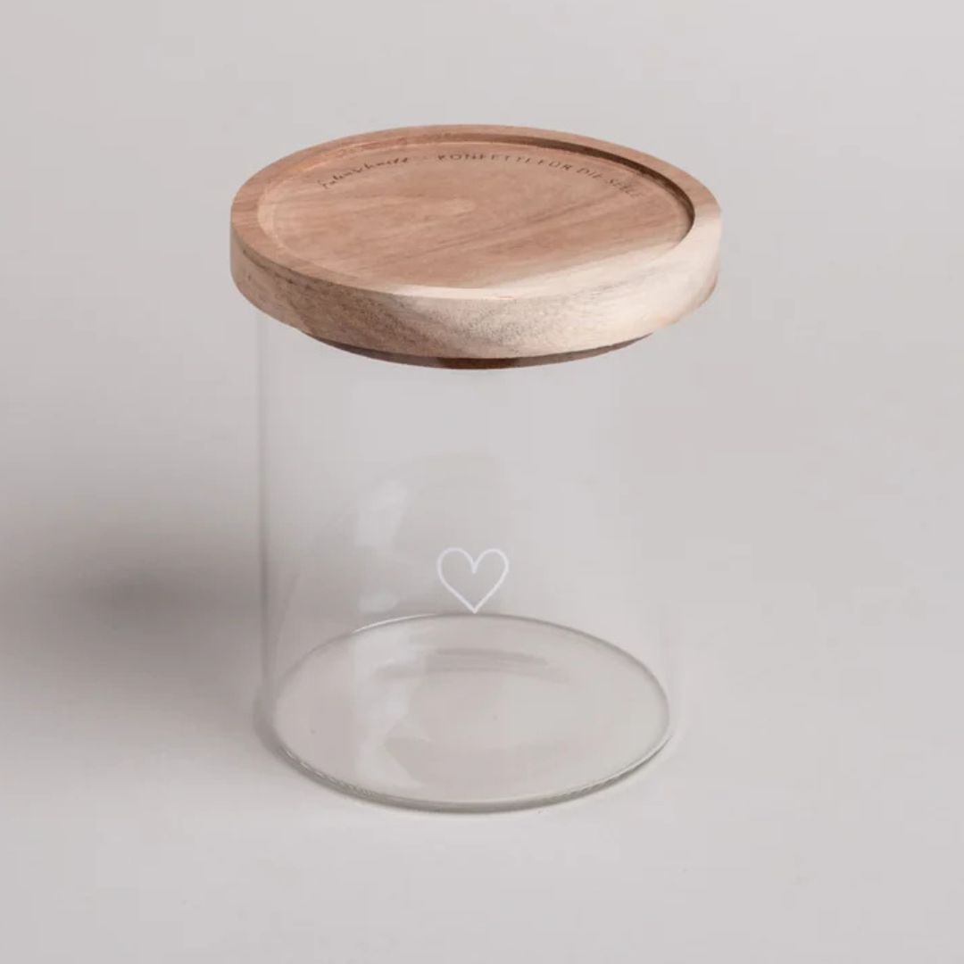 Questo elegante barattolo in vetro borosilicato con coperchio e motivo a cuore del brand Eulenschnitt, è un accessorio robusto e riciclabile. È perfetto per organizzare gli ingredienti della cucina in modo raffinato e romantico. Il design è completato da un cuore stampato in bianco, e il coperchio in acacia non trattata è dotato di anello in silicone per una chiusura ermetica, mantenendo il contenuto fresco a lungo.