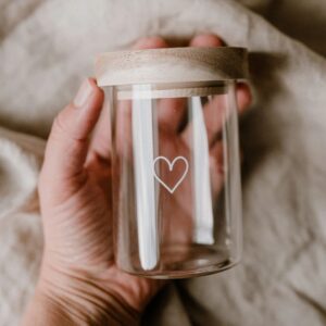 Barattolo in vetro borosilicato con coperchio in legno di acacia del brand Eulenschnitt con motivo a cuore bianco che completa il design in modo delicato. È l'accessorio perfetto per conservare spezie, erbe aromatiche o piccoli oggetti con stile e praticità.