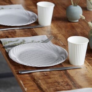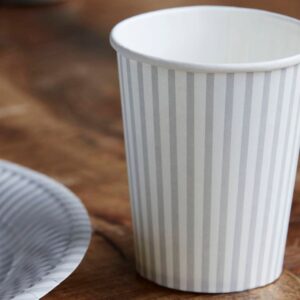 Questi bicchieri di carta dal design rigato grigio chiaro di House Doctor sono in confezione da 12 pz. Per le tue serate informali all'aperto o per una festa particolare con amici e famigliari, quando scegli la comodità del monouso ma non vuoi rinunciare all'eleganza di un bicchiere particolarmente raffinato ed esteticamente piacevole. L'obiettivo del design rigato infatti è proprio quello di rendere i bicchieri di carta più attraenti e distintivi, aggiungendo un tocco di stile alla tua tavola.
