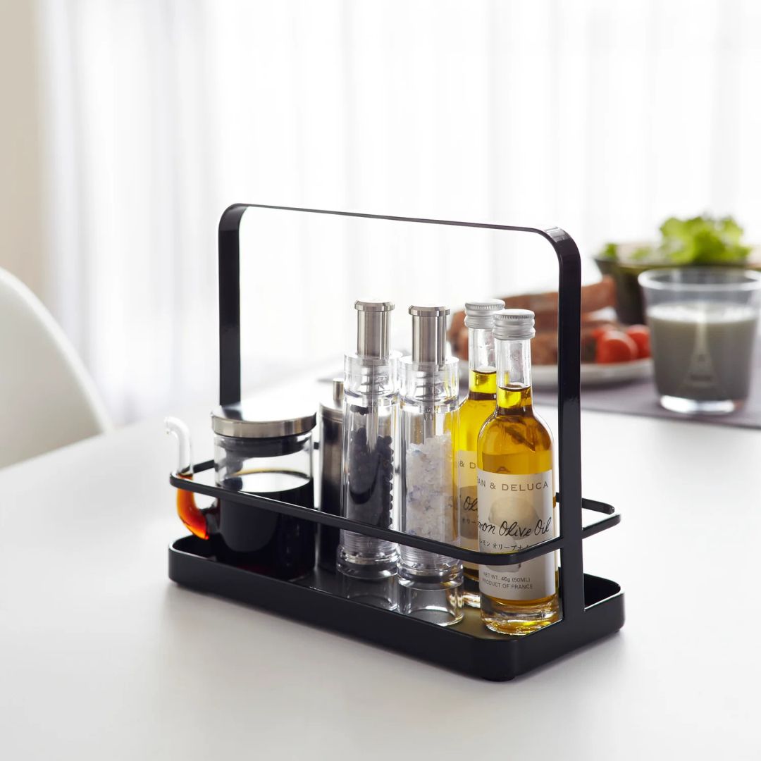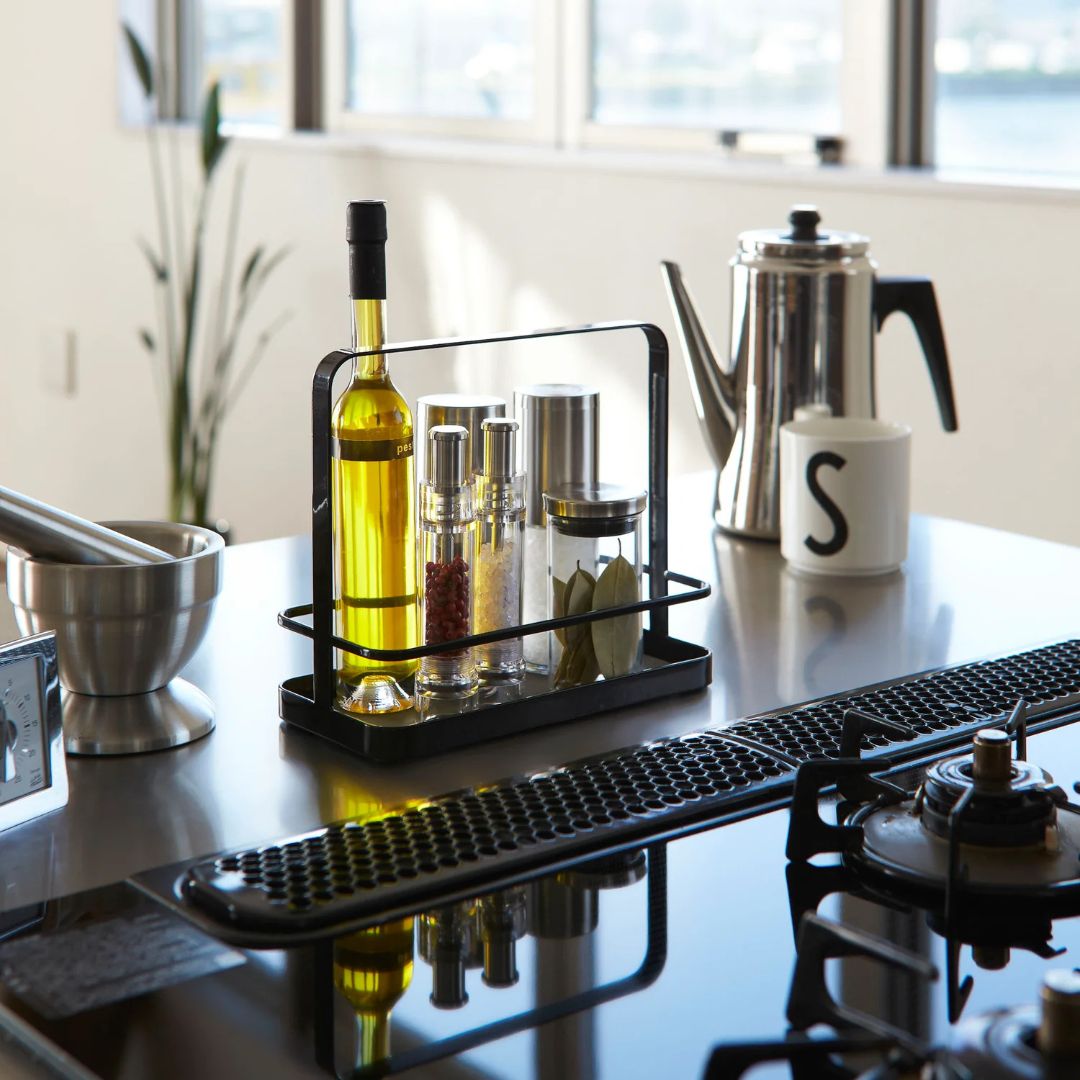 Il Portacondimenti del brand giapponese Yamazaki è la soluzione perfetta per organizzare spezie, oli e salse con eleganza minimal. Linee pulite, struttura solida in acciaio e una pratica maniglia lo rendono ideale per portare tutto in tavola con un solo gesto.