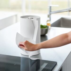 Solido e ben bilanciato, permette di strappare il foglio con una sola mano. Disponibile nelle classiche finiture bianco o nero opaco, si abbina facilmente a cucine moderne e nordiche.