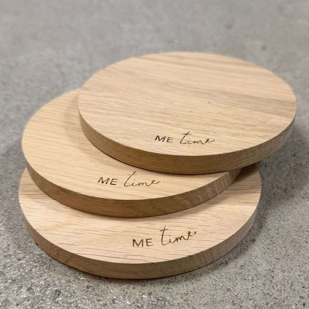 Questo sottobicchiere in legno di quercia del brand Eulenschnitt è un omaggio alla lentezza e ai momenti di pausa: ogni pezzo è inciso a laser con la scritta "Me Time", ossia "tempo per me", creando un effetto elegante e nautrale. Il legno di quercia è robusto, caldo al tatto e perfetto per proteggere superfici delicate con stile.