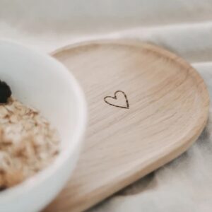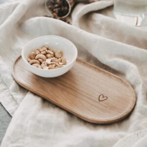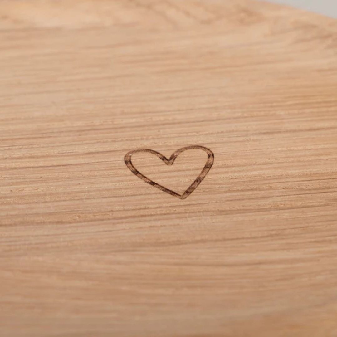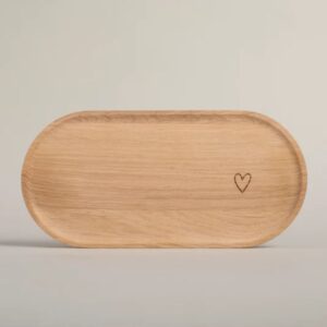 Questo vassoio ovale in legno di quercia del brand Eulenschnitt è decorato con un motivo a cuore stampato al laser ed è progettato per unire estetica romantica e praticità. Il legno naturale, con le sue venature calde, si sposa perfettamente con le linee delicate del cuore, per un risultato che valorizza ogni tavola, mensola o angolo living.