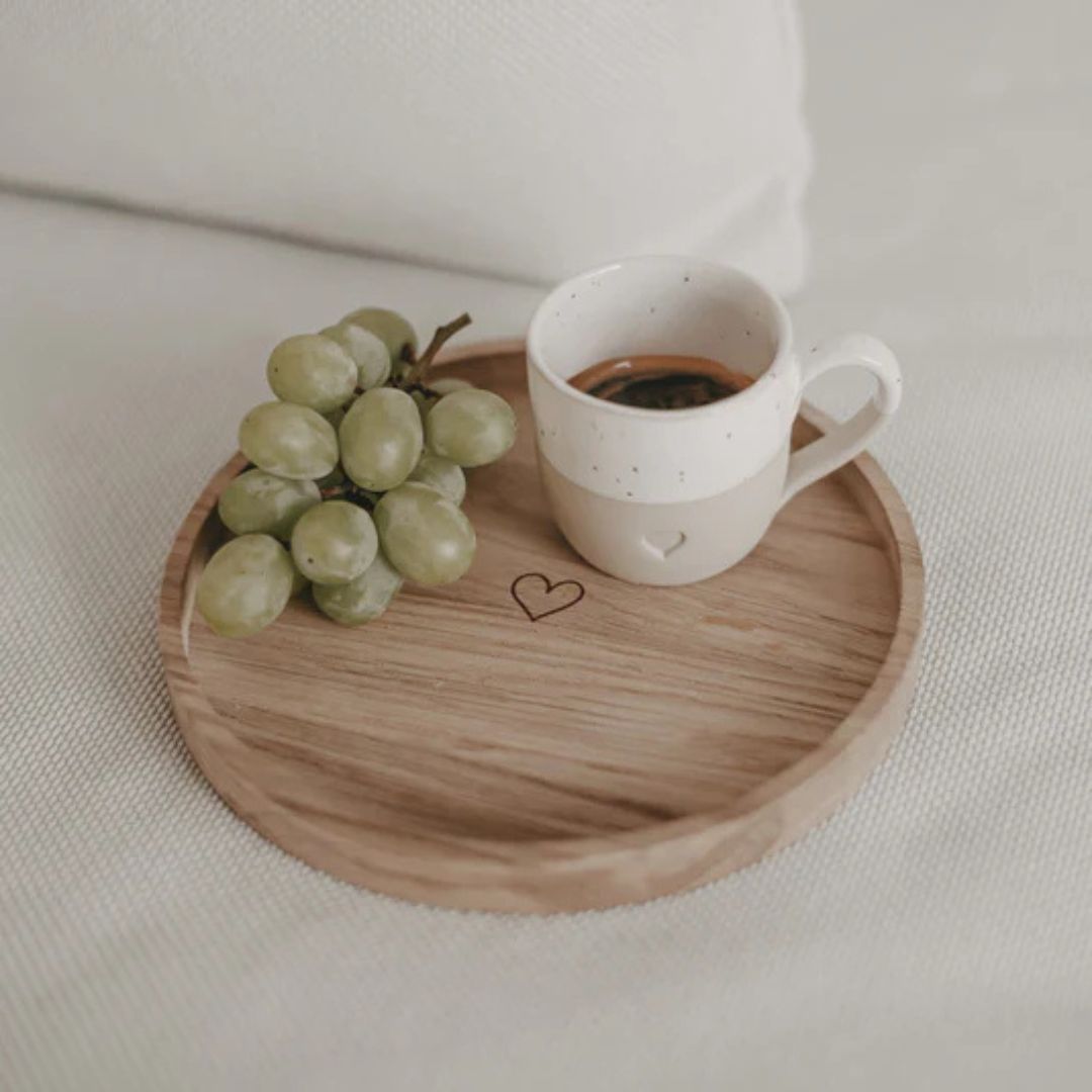 Questo vassoio rotondo in quercia del brand Eulenschnitt è decorato con un motivo a cuore stampato al laser, perfetto per servire piccoli dolci, frutta secca o bijoux. Il legno massello conferisce calore e naturalezza, mentre la forma compatta lo rende ideale anche come portaoggetti su tavolini, scrivanie o comodini.