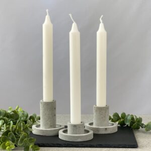 Il candelabro in cemento è disponibile in tre diverse misure: questo grande, piccolo e medio da poter abbinare tra loro per creare varie composizioni. Il foro può contenere una candela di diametro da 2,2 a 2,5 cm. circa, adatto quindi alla maggior parte delle candele a stelo di misura standard. Questo candelabro in cemento è un oggetto decorativo artigianale molto versatile, dalla forma semplice e geometrica, adatto ad ogni ambiente, occasione e stile di arredo.