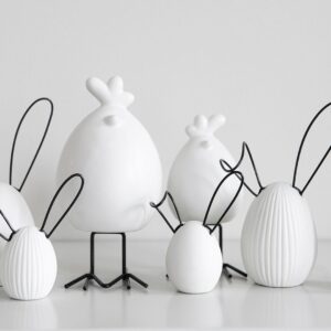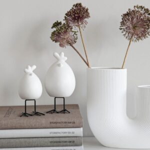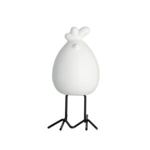 Questa giocosa decorazione raffigurante una gallina pasquale in ceramica bianca opaca di Storefactory è impreziosita dal dettaglio delle gambe che sono in metallo nero.