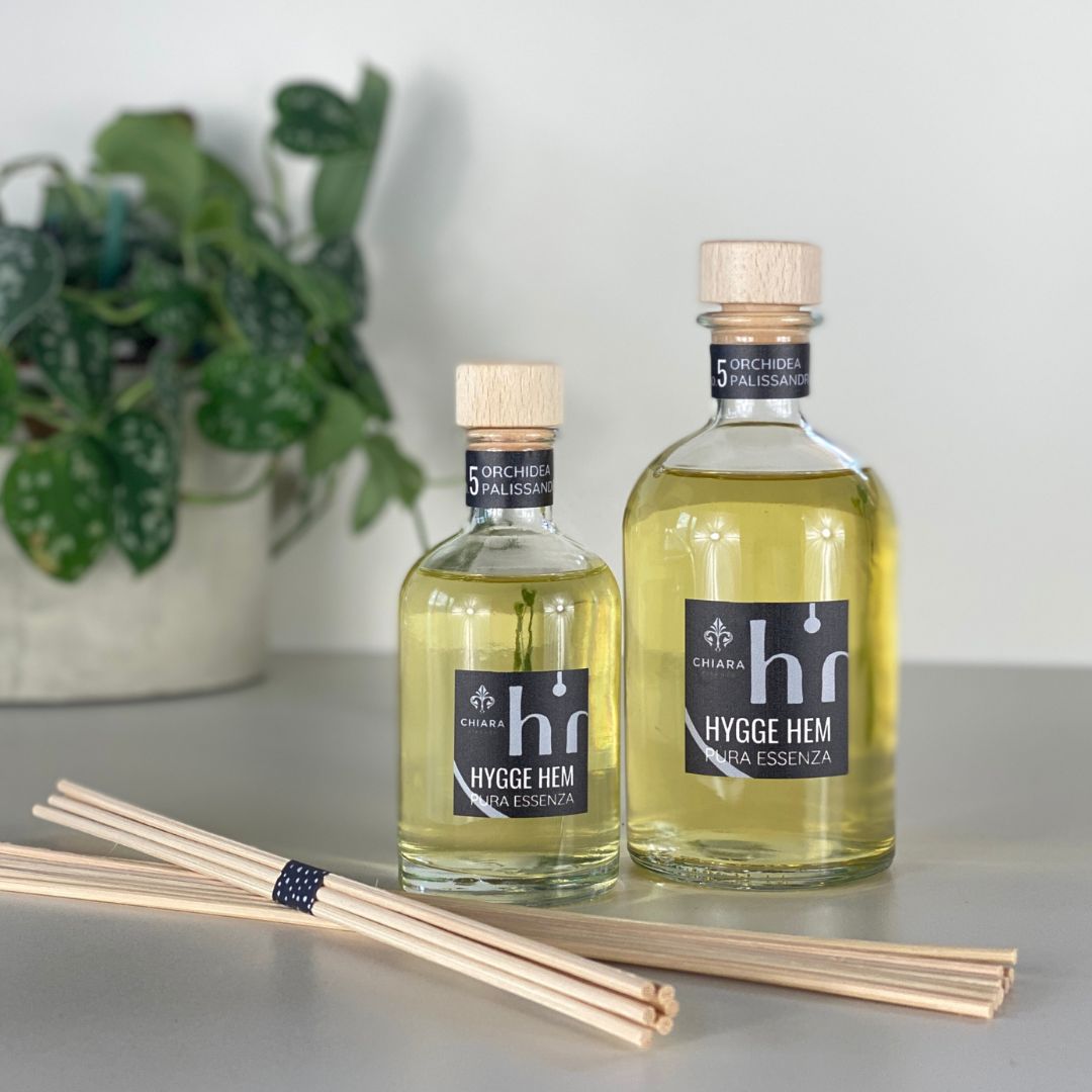 La linea di fragranze d'ambiente con bastoncini PURA ESSENZA di Hygge Hem nasce dalla passione autentica di maestri artigiani profumieri toscani. Ogni fragranza è realizzata a mano con una elevata concentrazione di oli essenziali, garantendo prodotti privi di OGM e derivati animali. Per la base viente utilizzato bio-alcol ottenuto dalla lavorazione della barbabietola da zucchero, e ogni fase, dall'imbottigliamento all'etichettatura, fino alla finitura con cavi di rame per i formati maggiori, è eseguita con cura artigianale per offrire un'esperienza sensoriale unica e di altissima qualità.